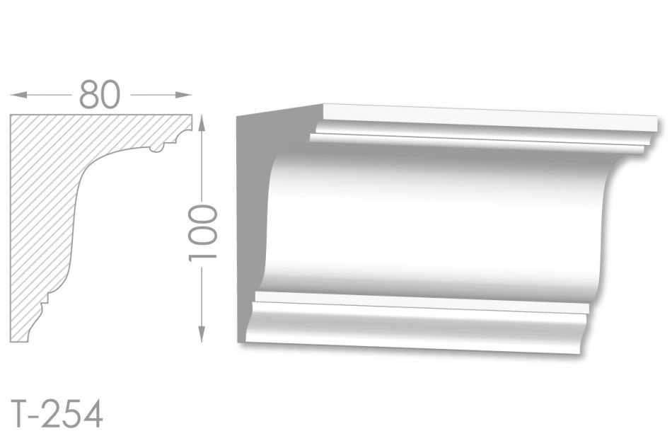 Молдинг – (Тяга) - універсальний декоративний елемент з гіпсу, оригінальної форми, який використовується для кріплення на вертикальну площину. Виріб призначений для декорування внутрішніх стін приміщень. Мета-створення особливого візуального ефекту, зонування стельової області, верхньої частини стін, завершення дизайнерського інтер'єру, внесення «останніх штрихів». Конструкція виконана з якісних матеріалів, колір – білий, відповідний кольору сировини. Молдинг може бути декорований відповідно до обраної колірної гами стилем, пофарбованим в необхідний відтінок. Параметри виробу: висота – 100 мм, ширина – 80 мм.