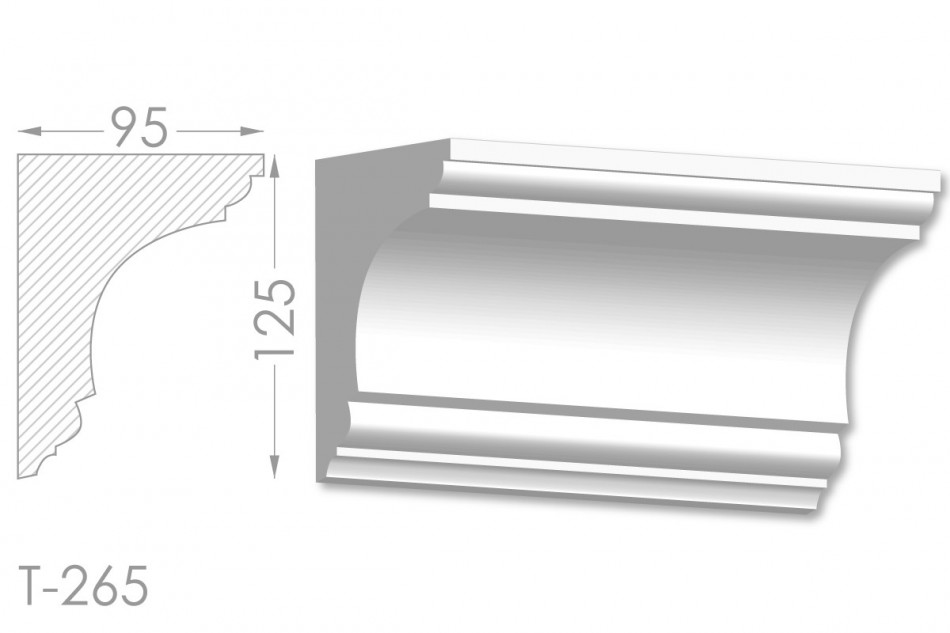 Молдинг – (Тяга) - універсальний декоративний елемент з гіпсу, оригінальної форми, який використовується для кріплення на вертикальну площину. Виріб призначений для декорування внутрішніх стін приміщень. Мета-створення особливого візуального ефекту, зонування стельової області, верхньої частини стін, завершення дизайнерського інтер'єру, внесення «останніх штрихів». Конструкція виконана з якісних матеріалів, колір – білий, відповідний кольору сировини. Молдинг може бути декорований відповідно до обраної колірної гами стилем, пофарбованим в необхідний відтінок. Параметри виробу: висота – 125 мм, ширина – 95 мм.