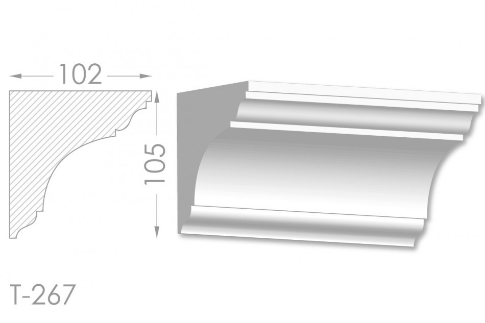 Молдинг – (Тяга) - універсальний декоративний елемент з гіпсу, оригінальної форми, який використовується для кріплення на вертикальну площину. Виріб призначений для декорування внутрішніх стін приміщень. Мета-створення особливого візуального ефекту, зонування стельової області, верхньої частини стін, завершення дизайнерського інтер'єру, внесення «останніх штрихів». Конструкція виконана з якісних матеріалів, колір – білий, відповідний кольору сировини. Молдинг може бути декорований відповідно до обраної колірної гами стилем, пофарбованим в необхідний відтінок. Параметри виробу: висота – 105 мм, ширина – 102 мм.