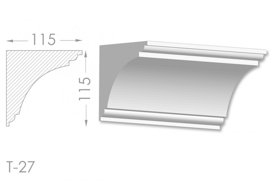 Молдинг – (Тяга) - універсальний декоративний елемент з гіпсу, оригінальної форми, який використовується для кріплення на вертикальну площину. Виріб призначений для декорування внутрішніх стін приміщень. Мета-створення особливого візуального ефекту, зонування стельової області, верхньої частини стін, завершення дизайнерського інтер'єру, внесення «останніх штрихів». Конструкція виконана з якісних матеріалів, колір – білий, відповідний кольору сировини. Молдинг може бути декорований відповідно до обраної колірної гами стилем, пофарбованим в необхідний відтінок. Параметри виробу: висота – 115 мм, ширина – 115 мм.