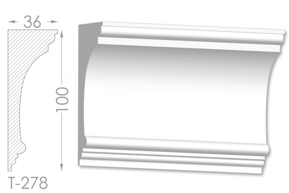 Молдинг – (Тяга) - універсальний декоративний елемент з гіпсу, оригінальної форми, який використовується для кріплення на вертикальну площину. Виріб призначений для декорування внутрішніх стін приміщень. Мета-створення особливого візуального ефекту, зонування стельової області, верхньої частини стін, завершення дизайнерського інтер'єру, внесення «останніх штрихів». Конструкція виконана з якісних матеріалів, колір – білий, відповідний кольору сировини. Молдинг може бути декорований відповідно до обраної колірної гами стилем, пофарбованим в необхідний відтінок. . Параметри виробу: висота – 100 мм, ширина – 36 мм.