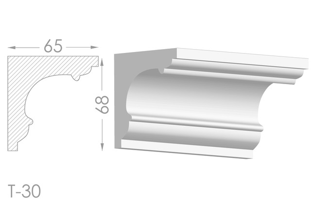 Молдинг – (Тяга) - універсальний декоративний елемент з гіпсу, оригінальної форми, який використовується для кріплення на вертикальну площину. Виріб призначений для декорування внутрішніх стін приміщень. Мета-створення особливого візуального ефекту, зонування стельової області, верхньої частини стін, завершення дизайнерського інтер'єру, внесення «останніх штрихів». Конструкція виконана з якісних матеріалів, колір – білий, відповідний кольору сировини. Молдинг може бути декорований відповідно до обраної колірної гами стилем, пофарбованим в необхідний відтінок. Параметри виробу: висота – 68 мм, ширина –65 мм.