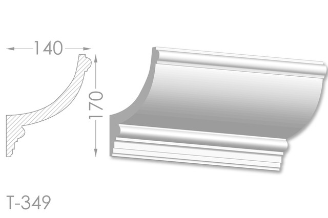 Молдинг – (Тяга) - універсальний декоративний елемент з гіпсу, оригінальної форми, який використовується для кріплення на вертикальну площину. Виріб призначений для декорування внутрішніх стін приміщень. Мета-створення особливого візуального ефекту, зонування стельової області, верхньої частини стін, завершення дизайнерського інтер'єру, внесення «останніх штрихів». Конструкція виконана з якісних матеріалів, колір – білий, відповідний кольору сировини. Молдинг може бути декорований відповідно до обраної колірної гами стилем, пофарбованим в необхідний відтінок. Параметри виробу: висота – 170 мм, ширина – 140 мм.