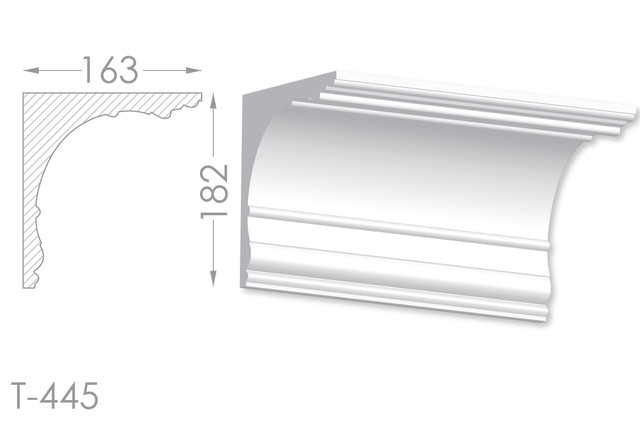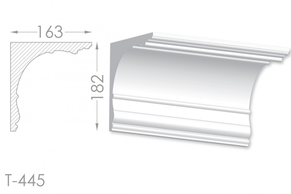 Молдинг – (Тяга) - універсальний декоративний елемент з гіпсу, оригінальної форми, який використовується для кріплення на вертикальну площину. Виріб призначений для декорування внутрішніх стін приміщень. Мета-створення особливого візуального ефекту, зонування стельової області, верхньої частини стін, завершення дизайнерського інтер'єру, внесення «останніх штрихів». Конструкція виконана з якісних матеріалів, колір – білий, відповідний кольору сировини. Молдинг може бути декорований відповідно до обраної колірної гами стилем, пофарбованим в необхідний відтінок. Параметри виробу: висота – 182 мм, ширина – 163 мм.