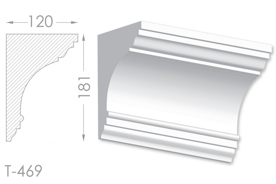 Молдинг – (Тяга) - універсальний декоративний елемент з гіпсу, оригінальної форми, який використовується для кріплення на вертикальну площину. Виріб призначений для декорування внутрішніх стін приміщень. Мета-створення особливого візуального ефекту, зонування стельової області, верхньої частини стін, завершення дизайнерського інтер'єру, внесення «останніх штрихів». Конструкція виконана з якісних матеріалів, колір – білий, відповідний кольору сировини. Молдинг може бути декорований відповідно до обраної колірної гами стилем, пофарбованим в необхідний відтінок. Параметри виробу: висота – 181 мм, ширина – 120 мм.