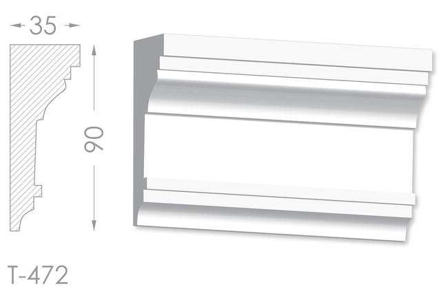 Молдинг – (Тяга) - універсальний декоративний елемент з гіпсу, оригінальної форми, який використовується для кріплення на вертикальну площину. Виріб призначений для декорування внутрішніх стін приміщень. Мета-створення особливого візуального ефекту, зонування стельової області, верхньої частини стін, завершення дизайнерського інтер'єру, внесення «останніх штрихів». Конструкція виконана з якісних матеріалів, колір – білий, відповідний кольору сировини. Молдинг може бути декорований відповідно до обраної колірної гами стилем, пофарбованим в необхідний відтінок. Параметри виробу: висота – 90 мм, ширина – 35 мм.