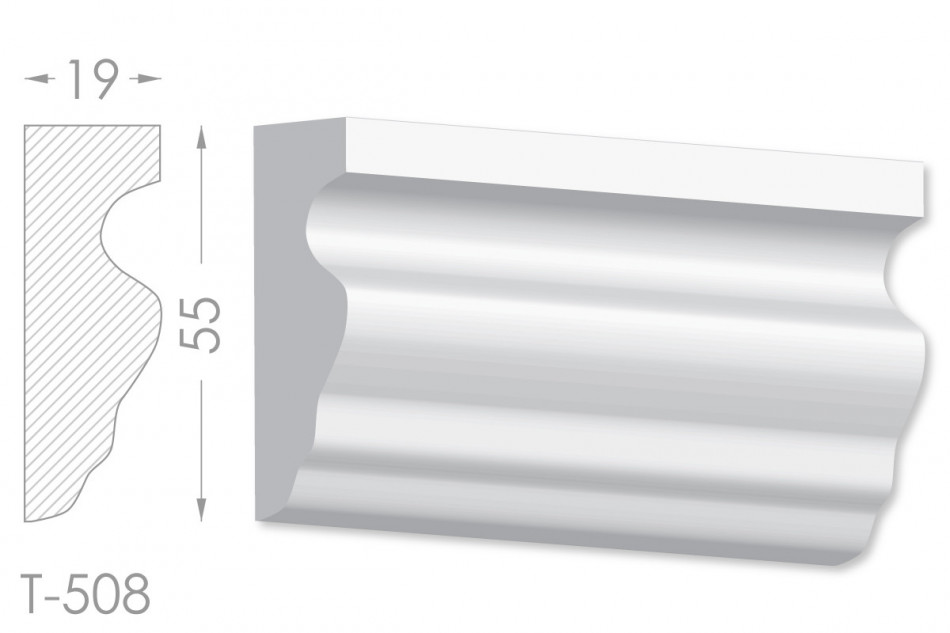 Молдинг – (Тяга) - універсальний декоративний елемент з гіпсу, оригінальної форми, який використовується для кріплення на вертикальну площину. Виріб призначений для декорування внутрішніх стін приміщень. Мета-створення особливого візуального ефекту, зонування стельової області, верхньої частини стін, завершення дизайнерського інтер'єру, внесення «останніх штрихів». Конструкція виконана з якісних матеріалів, колір – білий, відповідний кольору сировини. Молдинг може бути декорований відповідно до обраної колірної гами стилем, пофарбованим в необхідний відтінок. Параметри виробу: висота – 55 мм, ширина – 19 мм.
