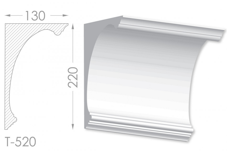 Молдинг – (Тяга) - універсальний декоративний елемент з гіпсу, оригінальної форми, який використовується для кріплення на вертикальну площину. Виріб призначений для декорування внутрішніх стін приміщень. Мета-створення особливого візуального ефекту, зонування стельової області, верхньої частини стін, завершення дизайнерського інтер'єру, внесення «останніх штрихів». Конструкція виконана з якісних матеріалів, колір – білий, відповідний кольору сировини. Молдинг може бути декорований відповідно до обраної колірної гами стилем, пофарбованим в необхідний відтінок. Параметри виробу: висота – 220 мм, ширина – 130 мм.