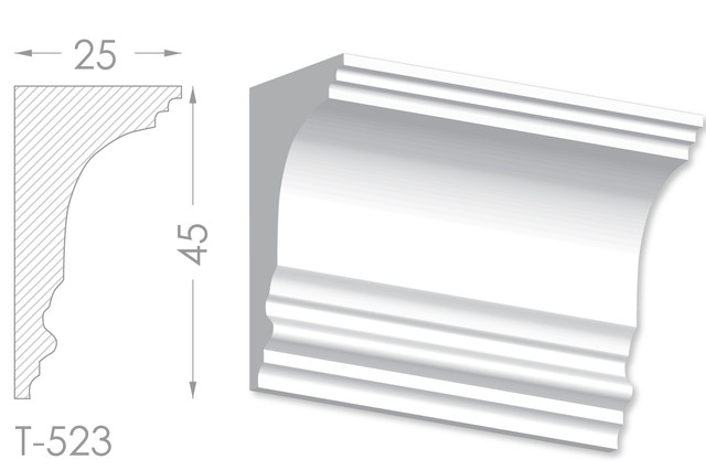 Молдинг – (Тяга) - універсальний декоративний елемент з гіпсу, оригінальної форми, який використовується для кріплення на вертикальну площину. Виріб призначений для декорування внутрішніх стін приміщень. Мета-створення особливого візуального ефекту, зонування стельової області, верхньої частини стін, завершення дизайнерського інтер'єру, внесення «останніх штрихів». Конструкція виконана з якісних матеріалів, колір – білий, відповідний кольору сировини. Молдинг може бути декорований відповідно до обраної колірної гами стилем, пофарбованим в необхідний відтінок. Параметри виробу: висота – 45 мм, ширина –25 мм.