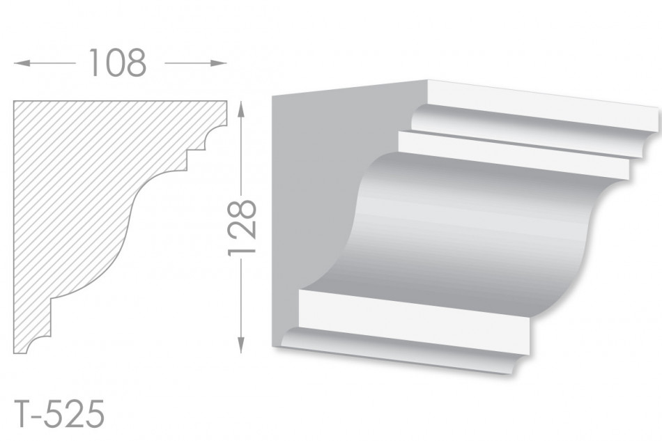 Молдинг – (Тяга) - універсальний декоративний елемент з гіпсу, оригінальної форми, який використовується для кріплення на вертикальну площину. Виріб призначений для декорування внутрішніх стін приміщень. Мета-створення особливого візуального ефекту, зонування стельової області, верхньої частини стін, завершення дизайнерського інтер'єру, внесення «останніх штрихів». Конструкція виконана з якісних матеріалів, колір – білий, відповідний кольору сировини. Молдинг може бути декорований відповідно до обраної колірної гами стилем, пофарбованим в необхідний відтінок. Параметри виробу: висота – 128 мм, ширина –108 мм.
