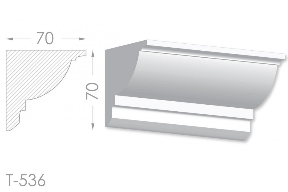 Молдинг – (Тяга) - універсальний декоративний елемент з гіпсу, оригінальної форми, який використовується для кріплення на вертикальну площину. Виріб призначений для декорування внутрішніх стін приміщень. Мета-створення особливого візуального ефекту, зонування стельової області, верхньої частини стін, завершення дизайнерського інтер'єру, внесення «останніх штрихів». Конструкція виконана з якісних матеріалів, колір – білий, відповідний кольору сировини. Молдинг може бути декорований відповідно до обраної колірної гами стилем, пофарбованим в необхідний відтінок. Параметри виробу: висота – 70 мм, ширина – 70 мм.
