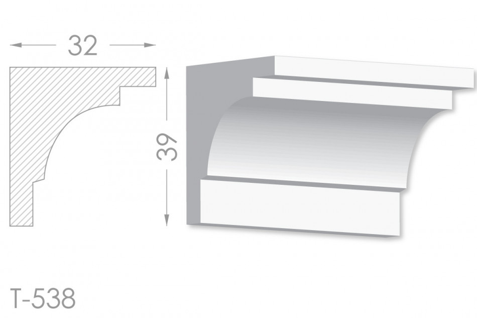 Молдинг – (Тяга) - універсальний декоративний елемент з гіпсу, оригінальної форми, який використовується для кріплення на вертикальну площину. Виріб призначений для декорування внутрішніх стін приміщень. Мета-створення особливого візуального ефекту, зонування стельової області, верхньої частини стін, завершення дизайнерського інтер'єру, внесення «останніх штрихів». Конструкція виконана з якісних матеріалів, колір – білий, відповідний кольору сировини. Молдинг може бути декорований відповідно до обраної колірної гами стилем, пофарбованим в необхідний відтінок. Параметри виробу: висота – 39 мм, ширина – 32 мм.