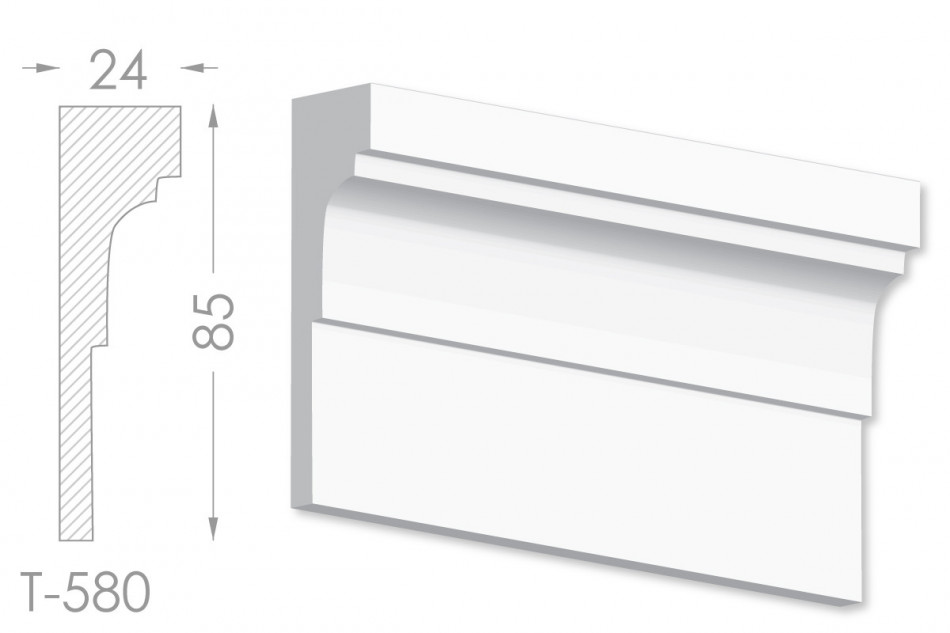 Молдинг – (Тяга) - універсальний декоративний елемент з гіпсу, оригінальної форми, який використовується для кріплення на вертикальну площину. Виріб призначений для декорування внутрішніх стін приміщень. Мета-створення особливого візуального ефекту, зонування стельової області, верхньої частини стін, завершення дизайнерського інтер'єру, внесення «останніх штрихів». Конструкція виконана з якісних матеріалів, колір – білий, відповідний кольору сировини. Молдинг може бути декорований відповідно до обраної колірної гами стилем, пофарбованим в необхідний відтінок. Параметри виробу: висота – 85 мм, ширина – 24 мм.