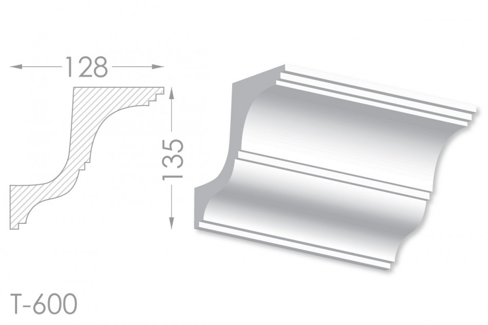 Молдинг – (Тяга) - універсальний декоративний елемент з гіпсу, оригінальної форми, який використовується для кріплення на вертикальну площину. Виріб призначений для декорування внутрішніх стін приміщень. Мета-створення особливого візуального ефекту, зонування стельової області, верхньої частини стін, завершення дизайнерського інтер'єру, внесення «останніх штрихів». Конструкція виконана з якісних матеріалів, колір – білий, відповідний кольору сировини. Молдинг може бути декорований відповідно до обраної колірної гами стилем, пофарбованим в необхідний відтінок. Параметри виробу: висота – 135 мм, ширина – 128 мм.