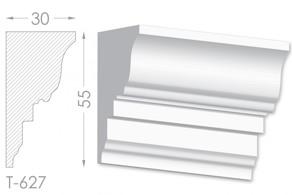 Молдинг – (Тяга) - універсальний декоративний елемент з гіпсу, оригінальної форми, який використовується для кріплення на вертикальну площину. Виріб призначений для декорування внутрішніх стін приміщень. Мета-створення особливого візуального ефекту, зонування стельової області, верхньої частини стін, завершення дизайнерського інтер'єру, внесення «останніх штрихів». Конструкція виконана з якісних матеріалів, колір – білий, відповідний кольору сировини. Молдинг може бути декорований відповідно до обраної колірної гами стилем, пофарбованим в необхідний відтінок. Параметри виробу: висота – 55 мм, ширина – 30 мм.
