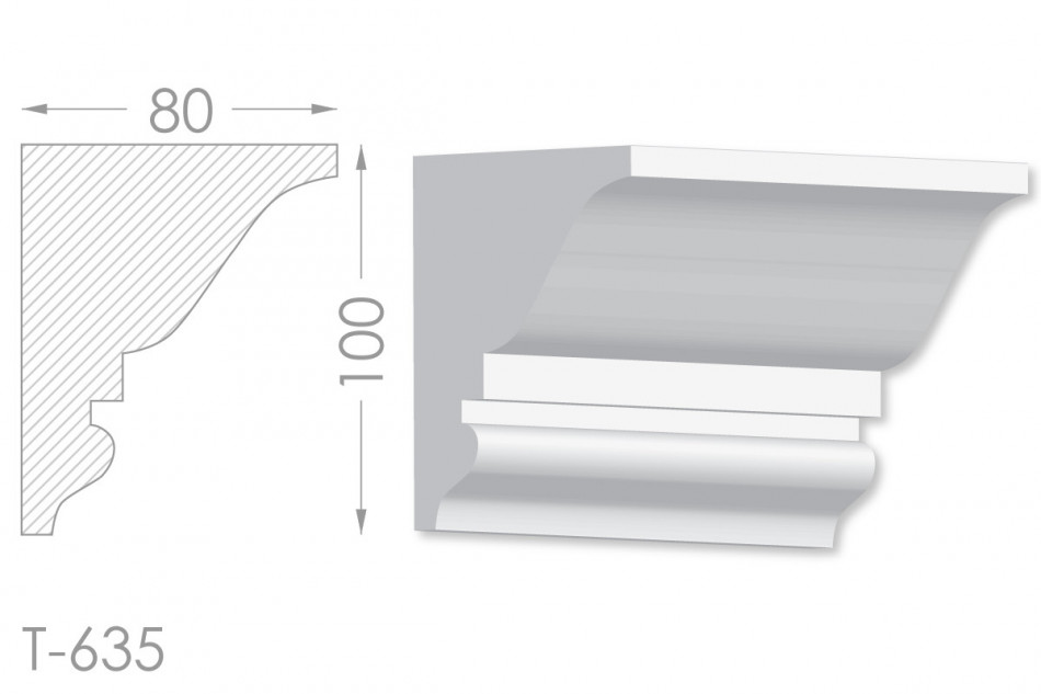 Молдинг – (Тяга) - універсальний декоративний елемент з гіпсу, оригінальної форми, який використовується для кріплення на вертикальну площину. Виріб призначений для декорування внутрішніх стін приміщень. Мета-створення особливого візуального ефекту, зонування стельової області, верхньої частини стін, завершення дизайнерського інтер'єру, внесення «останніх штрихів». Конструкція виконана з якісних матеріалів, колір – білий, відповідний кольору сировини. Молдинг може бути декорований відповідно до обраної колірної гами стилем, пофарбованим в необхідний відтінок. Параметри виробу: висота – 100 мм, ширина – 80 мм.