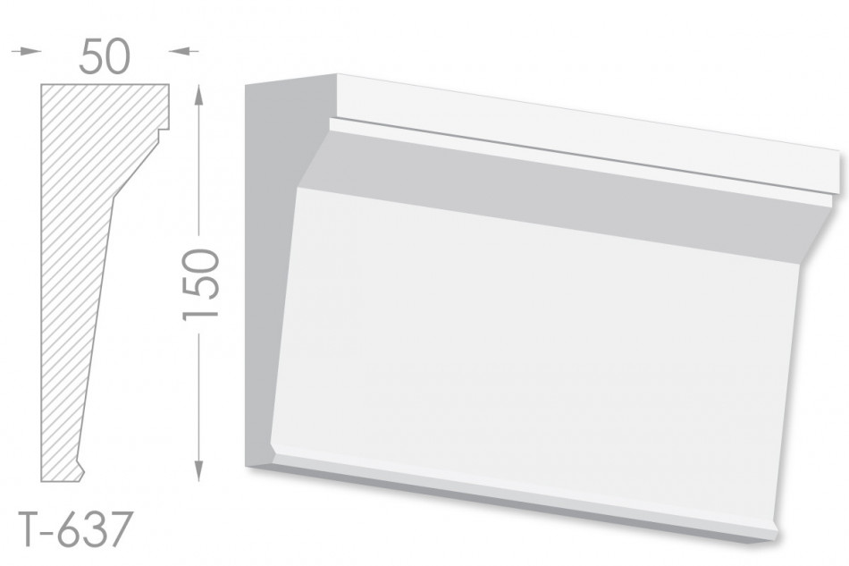 Молдинг – (Тяга) - універсальний декоративний елемент з гіпсу, оригінальної форми, який використовується для кріплення на вертикальну площину. Виріб призначений для декорування внутрішніх стін приміщень. Мета-створення особливого візуального ефекту, зонування стельової області, верхньої частини стін, завершення дизайнерського інтер'єру, внесення «останніх штрихів». Конструкція виконана з якісних матеріалів, колір – білий, відповідний кольору сировини. Молдинг може бути декорований відповідно до обраної колірної гами стилем, пофарбованим в необхідний відтінок. Параметри виробу: висота – 150 мм, ширина – 50 мм.