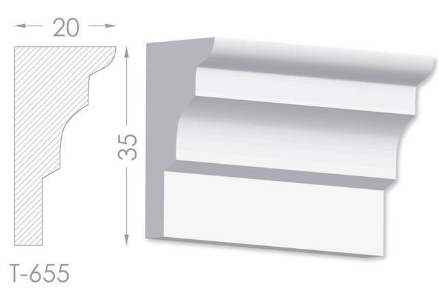 Молдинг – (Тяга) - універсальний декоративний елемент з гіпсу, оригінальної форми, який використовується для кріплення на вертикальну площину. Виріб призначений для декорування внутрішніх стін приміщень. Мета-створення особливого візуального ефекту, зонування стельової області, верхньої частини стін, завершення дизайнерського інтер'єру, внесення «останніх штрихів». Конструкція виконана з якісних матеріалів, колір – білий, відповідний кольору сировини. Молдинг може бути декорований відповідно до обраної колірної гами стилем, пофарбованим в необхідний відтінок. Параметри виробу: висота – 35 мм, ширина – 20 мм.