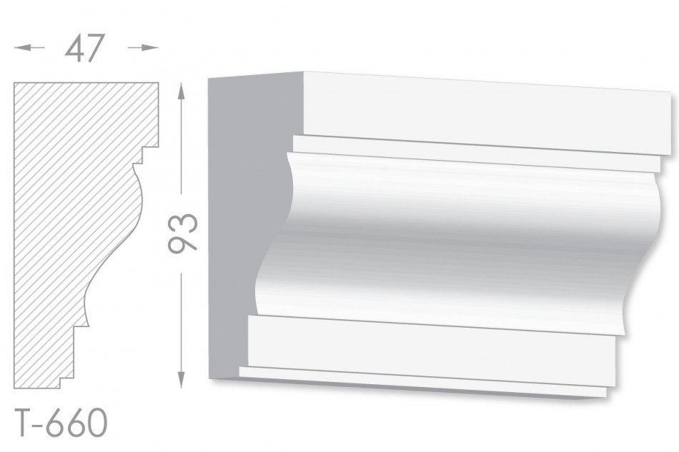 Молдинг – (Тяга) - універсальний декоративний елемент з гіпсу, оригінальної форми, який використовується для кріплення на вертикальну площину. Виріб призначений для декорування внутрішніх стін приміщень. Мета-створення особливого візуального ефекту, зонування стельової області, верхньої частини стін, завершення дизайнерського інтер'єру, внесення «останніх штрихів». Конструкція виконана з якісних матеріалів, колір – білий, відповідний кольору сировини. Молдинг може бути декорований відповідно до обраної колірної гами стилем, пофарбованим в необхідний відтінок. Параметри виробу: висота – 93 мм, ширина – 47 мм.