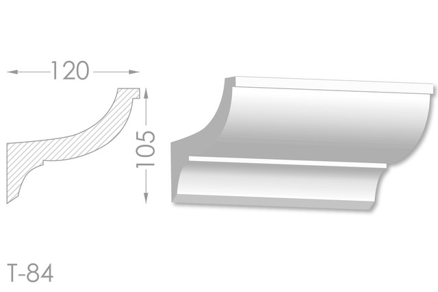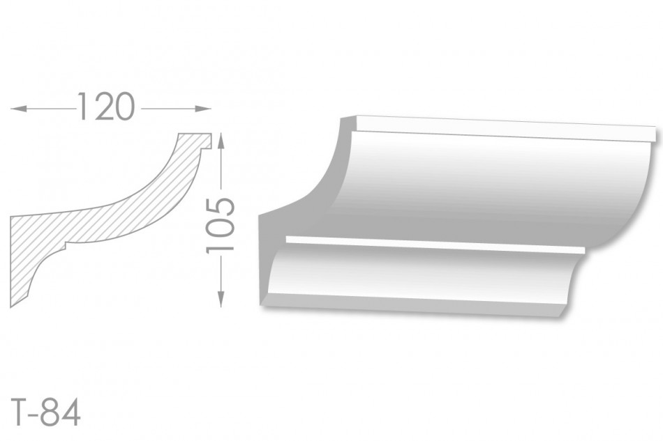 Молдинг – (Тяга) - універсальний декоративний елемент з гіпсу, оригінальної форми, який використовується для кріплення на вертикальну площину. Виріб призначений для декорування внутрішніх стін приміщень. Мета-створення особливого візуального ефекту, зонування стельової області, верхньої частини стін, завершення дизайнерського інтер'єру, внесення «останніх штрихів». Конструкція виконана з якісних матеріалів, колір – білий, відповідний кольору сировини. Молдинг може бути декорований відповідно до обраної колірної гами стилем, пофарбованим в необхідний відтінок. Параметри виробу: висота – 105 мм, ширина – 120 мм.