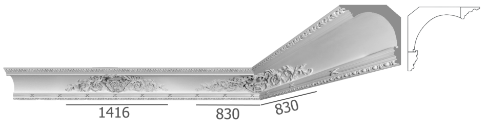 К‑276 — монументальний гіпсовий карниз висотою 320 мм і шириною 385 мм, оздоблений досконалим рельєфом із розкішними архітектурними мотивами. Це справжній акцент інтер’єру, який формує візуальний ритм і створює відчуття гармонійної величі. Масивний профіль і витончений орнамент поєднують архітектурну статику з декоративною елегантністю.