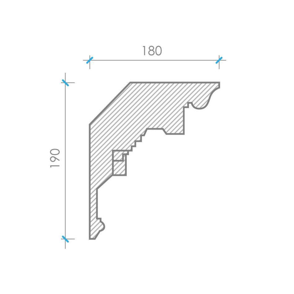 К‑18 — декоративний гіпсовий карниз висотою 190 мм та шириною 180 мм, виконаний у класичному стилі з характерним об'ємним орнаментом у вигляді повторювальних скульптурних консолей та акантових деталей. Його величавий, масивний профіль з виразною багатошаровою композицією створює архітектурно престижний ефект, надаючи інтер'єру класичної величавості та скульптурної вишуканості, при цьому зберігаючи гармонійні пропорції та стильну класичність.
