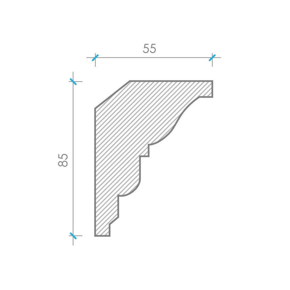 К‑20 — декоративний гіпсовий карниз висотою 85 мм та шириною 55 мм, виконаний у класичному стилі з характерним орнаментом у вигляді повторювальних м'яких консолей та скульптурних деталей. Його збалансований, елегантний профіль з виразною фриз-композицією створює гармонійний архітектурний ефект, надаючи інтер'єру класичної грації та художньої витонченості, при цьому зберігаючи оптимальні пропорції та плавність.