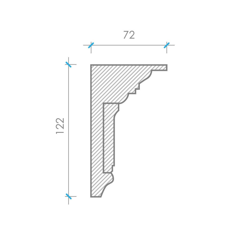 К‑33 — декоративний гіпсовий карниз висотою 122 мм та шириною 72 мм, виконаний у неокласичному стилі з характерним архітектурним орнаментом у вигляді повторювальних вертикальних канелюр та прямих ліній. Його строгий, впевнений профіль з виразною структурованою композицією створює архітектурно престижний ефект, надаючи інтер'єру неокласичної величавості та геометричної чіткості, при цьому зберігаючи класичні пропорції та архітектурну грамотність.