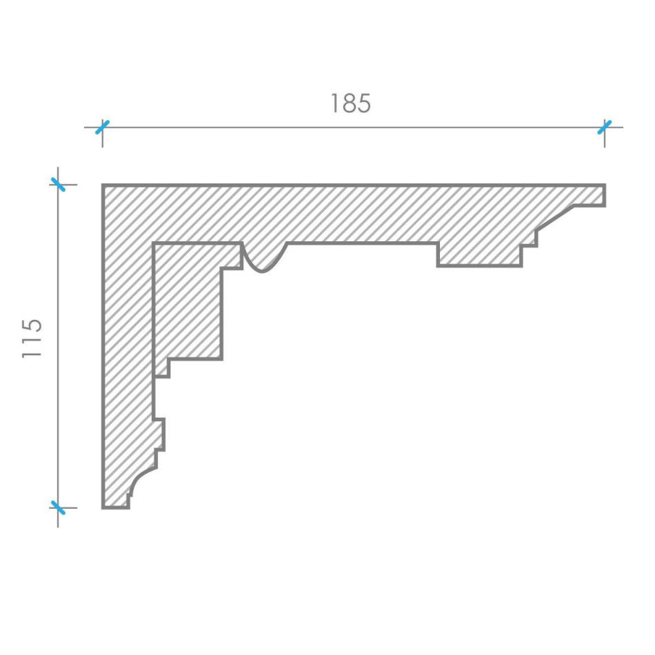 К‑53а — декоративний гіпсовий карниз висотою 115 мм та шириною 185 мм, виконаний у класичному стилі з характерним архітектурним орнаментом у вигляді повторювальних геометричних консолей та прямих ліній. Його величавий, впевнений профіль з виразною структурованою композицією створює архітектурно престижний ефект, надаючи інтер'єру класичної величавості та геометричної чіткості, при цьому зберігаючи оптимальні пропорції та архітектурну грамотність.