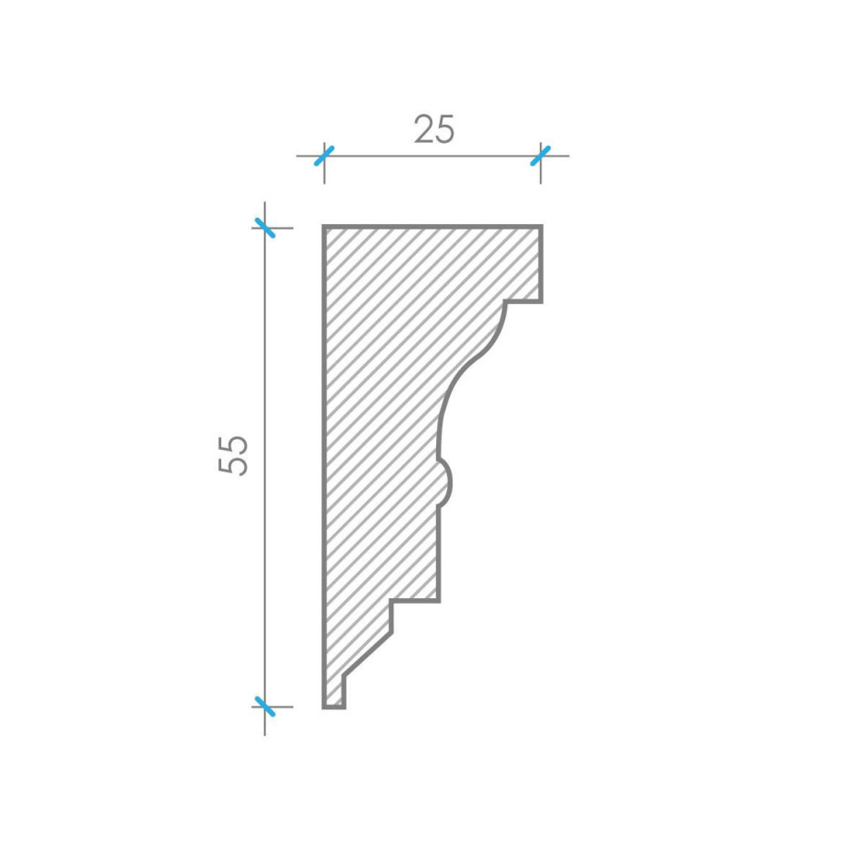 К‑56 — декоративний гіпсовий карниз висотою 55 мм та шириною 25 мм, виконаний у класичному стилі з характерним архітектурним орнаментом у вигляді повторювальних геометричних кубічних консолей. Його компактний, елегантний профіль з виразною структурованою композицією створює архітектурно вишуканий ефект, надаючи інтер'єру класичної строгості та геометричної чіткості, при цьому зберігаючи оптимальні пропорції та архітектурну грамотність.
