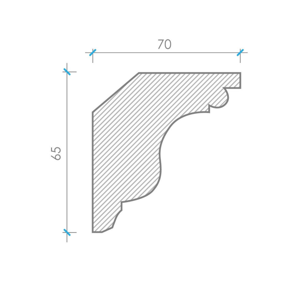 К‑65 — декоративний гіпсовий карниз висотою 65 мм та шириною 70 мм, виконаний у класичному стилі з характерним органічним орнаментом у вигляді повторювальних м'яких скульптурних гирлянд та декоративних мотивів. Його елегантний, гармонійний профіль з виразною пластичною композицією створює архітектурно вишуканий ефект, надаючи інтер'єру класичної грації та скульптурної глибини, при цьому зберігаючи оптимальні пропорції та плавність.