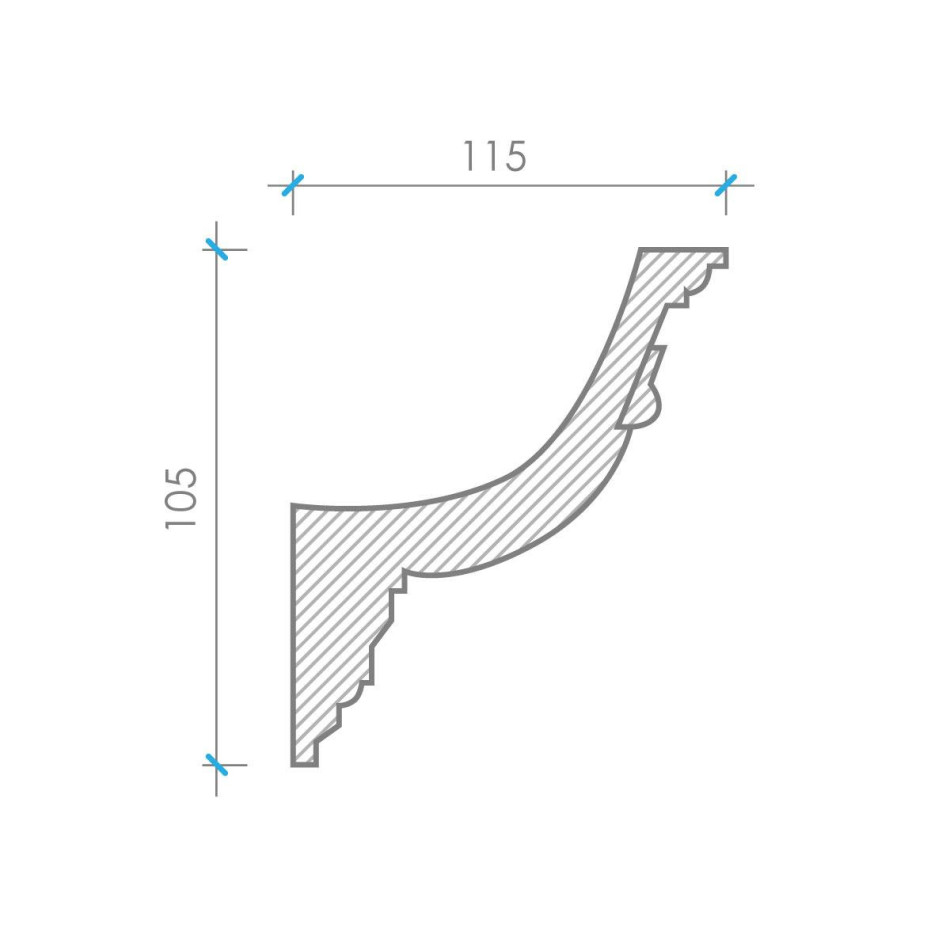 К‑93 — декоративний гіпсовий карниз висотою 105 мм та шириною 115 мм, виконаний у класичному стилі з характерним об'ємним орнаментом у вигляді м'яких скульптурних модульйонів та спіральних деталей. Його величавий, гармонійний профіль з виразною пластичною композицією створює архітектурно престижний ефект, надаючи інтер'єру класичної величавості та скульптурної глибини, при цьому зберігаючи оптимальні пропорції та плавність.