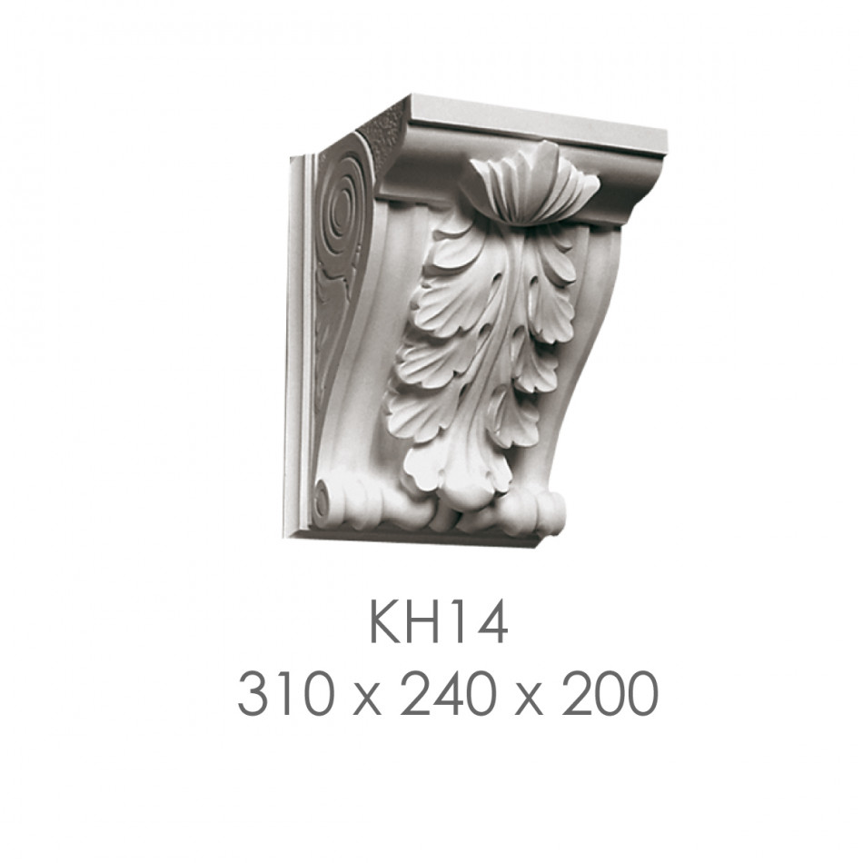 КН-14 — гіпсовий архітектурний кронштейн з вишуканими скульптурними елементами у формі класичного масивного консольного кронштейна з багатою декоративною пластикою. Композиція поєднує органічні архітектурні форми з деталізованими листками акантуса, волютами, спіральними елементами та барельєфним орнаментом. Монументальна композиція призначена для підтримки полиць, карнизів та архітектурних елементів значних розмірів, створюючи вишуканий архітектурний ансамбль, ідеальний для оформлення великих внутрішніх приміщень, типовий для елітних інтер'єрів класицизму та неокласики.