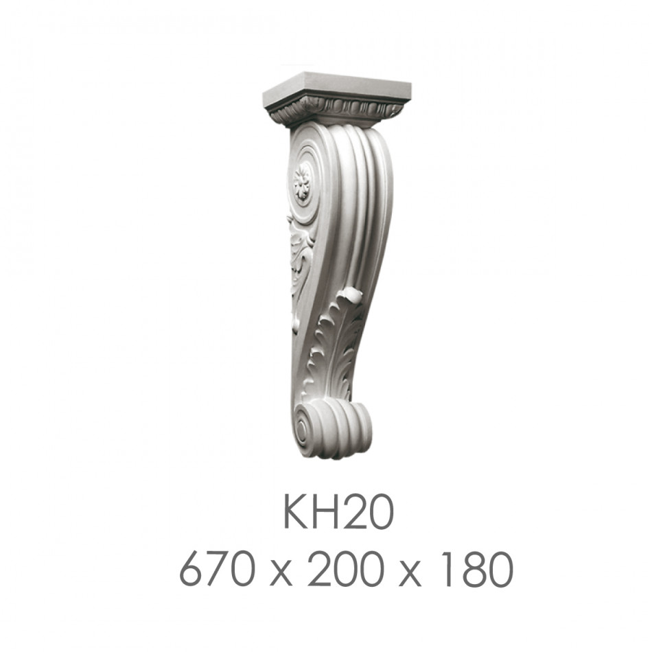 КН-20 — гіпсовий архітектурний кронштейн з вишуканими скульптурними елементами у формі класичної масивної капітелі з багатою декоративною пластикою. Композиція поєднує органічні архітектурні форми класичного ордеру з деталізованими вертикальними канелюрами, листками акантуса, спіральними волютами та барельєфним орнаментом. Монументальна композиція призначена для підтримки великих полиць, карнизів та архітектурних елементів значних розмірів, створюючи величавий архітектурний ансамбль, ідеальний для оформлення великих внутрішніх приміщень, типовий для елітних інтер'єрів класицизму та неокласики.