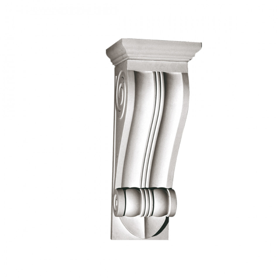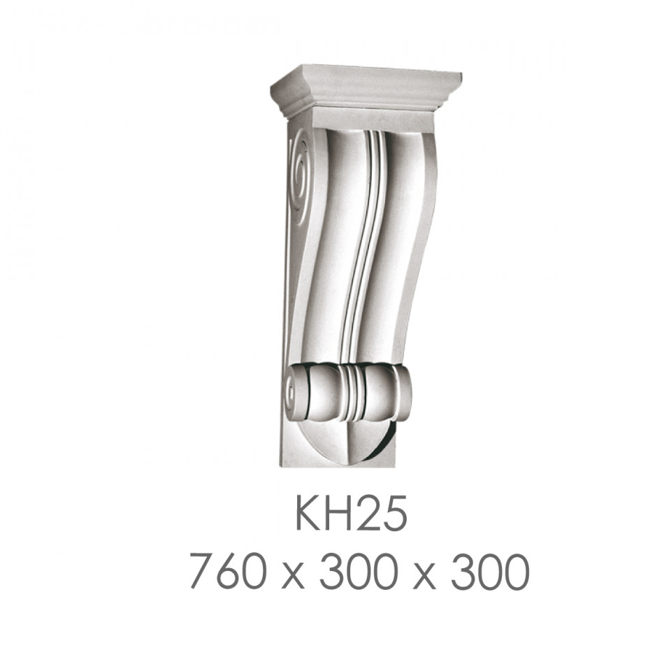 КН-25 — гіпсовий архітектурний кронштейн з вишуканими скульптурними елементами у формі грандіозної класичної капітелі з багатою декоративною пластикою. Композиція поєднує органічні архітектурні форми класичного ордеру з деталізованими вертикальними канелюрами, спіральними волютами та барельєфним оформленням. Монументальна композиція класичної консолі призначена для підтримки масивних полиць, карнизів та архітектурних елементів значних розмірів, створюючи грандіозний архітектурний ансамбль, ідеальний для оформлення масивних внутрішніх приміщень, типовий для палацових та елітних інтер'єрів класицизму та неокласики.