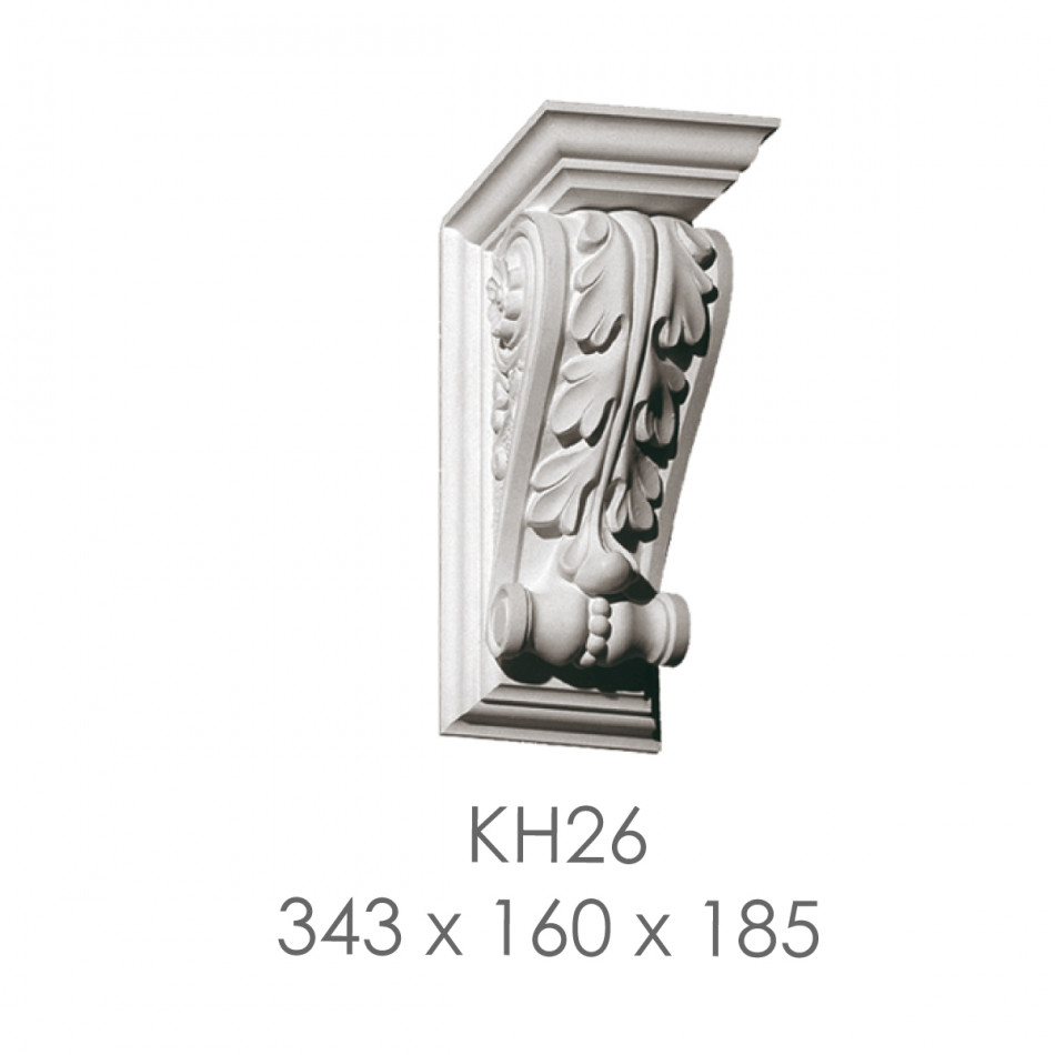 КН-26 — гіпсовий архітектурний кронштейн з вишуканими скульптурними елементами у формі класичної капітелі з багатою декоративною пластикою. Композиція поєднує органічні архітектурні форми класичного ордеру з деталізованими листками акантуса, спіральними волютами, абакою та барельєфним оформленням. Вертикальна композиція призначена для підтримки полиць, карнизів та архітектурних елементів, створюючи вишуканий архітектурний ансамбль, ідеальний для оформлення внутрішніх приміщень, типовий для елітних інтер'єрів класицизму та неокласики.
