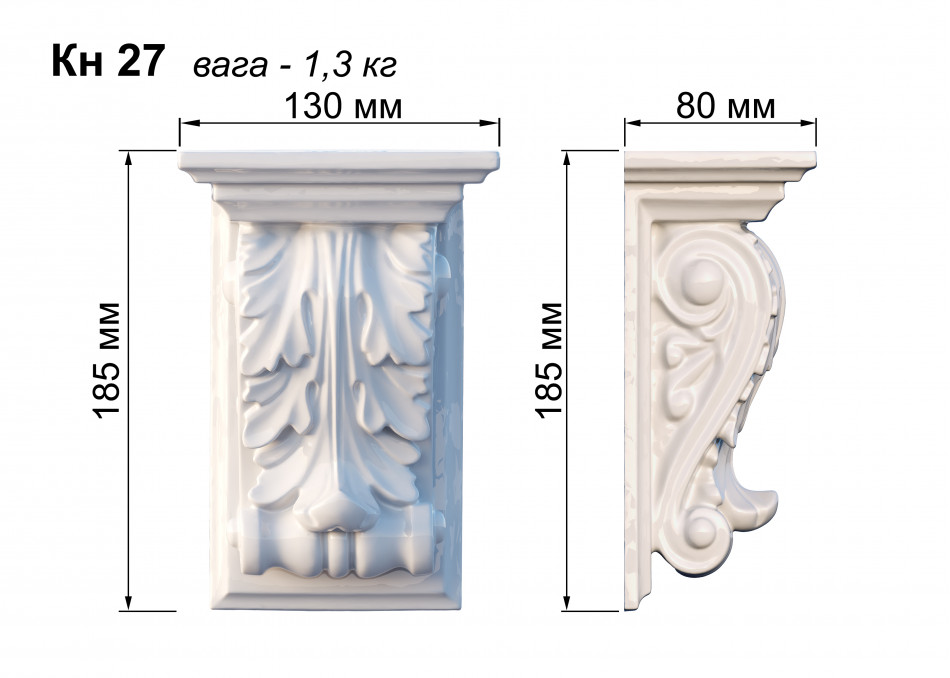 КН-27 — гіпсовий архітектурний кронштейн з вишуканими скульптурними елементами у формі компактної класичної капітелі з багатою декоративною пластикою. Композиція поєднує органічні архітектурні форми класичного ордеру з деталізованими листками акантуса та барельєфним оформленням. Компактна вертикальна композиція призначена для підтримки малих та середніх полиць, карнизів та архітектурних елементів, створюючи вишуканий архітектурний ансамбль, ідеальний для оформлення внутрішніх приміщень, типовий для елітних та класичних інтер'єрів.
