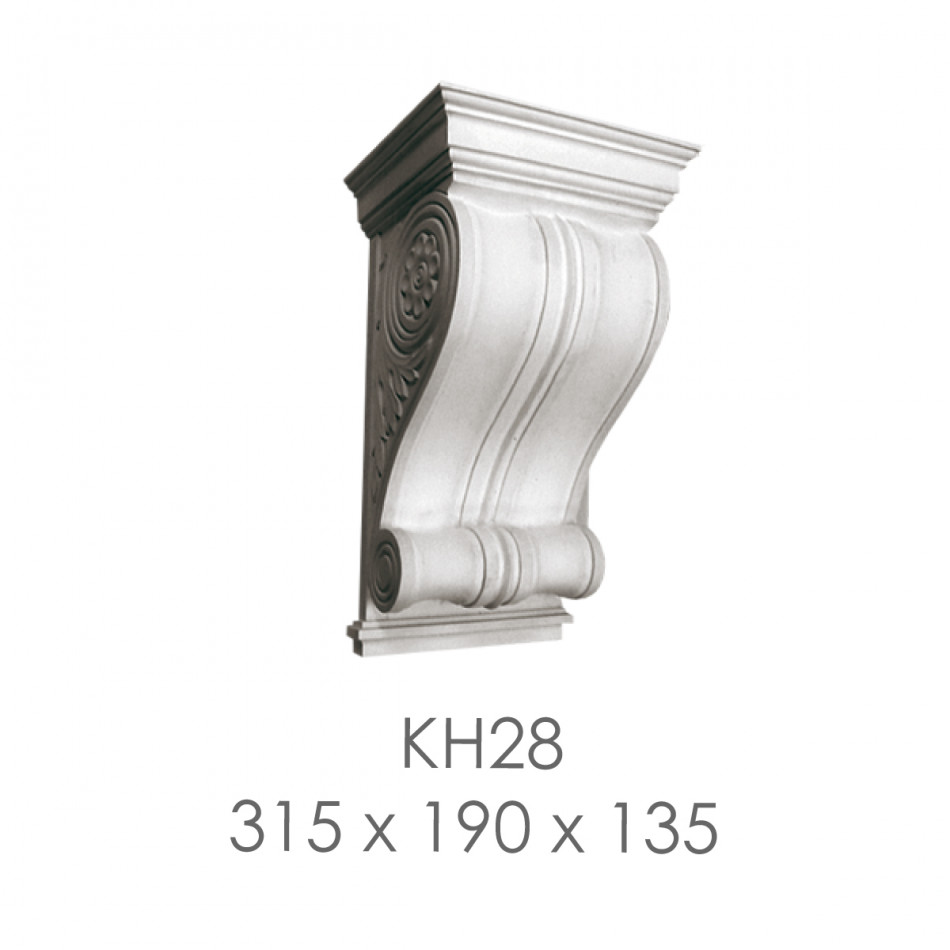 КН-28 — гіпсовий архітектурний кронштейн з вишуканими скульптурними елементами у формі класичної капітелі з багатою декоративною пластикою. Композиція поєднує органічні архітектурні форми класичного ордеру з деталізованими спіральними канелюрами, розетками, листками акантуса та барельєфним оформленням. Вертикальна композиція призначена для підтримки полиць, карнизів та архітектурних елементів, створюючи вишуканий архітектурний ансамбль, ідеальний для оформлення внутрішніх приміщень, типовий для елітних інтер'єрів класицизму та неокласики.