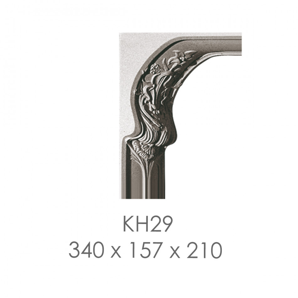 КН-29 — гіпсовий архітектурний кронштейн з вишуканими скульптурними елементами у формі класичної ангельської голови з багатою декоративною пластикою. Композиція поєднує органічні архітектурні форми класичного ордеру з деталізованим профільним обрисом, спіральними волютами, листками акантуса та барельєфним оформленням. Вертикальна композиція призначена для підтримки полиць, карнизів та архітектурних елементів, створюючи вишуканий архітектурний ансамбль, ідеальний для оформлення внутрішніх приміщень, типовий для елітних та палацових інтер'єрів класицизму та неокласики.