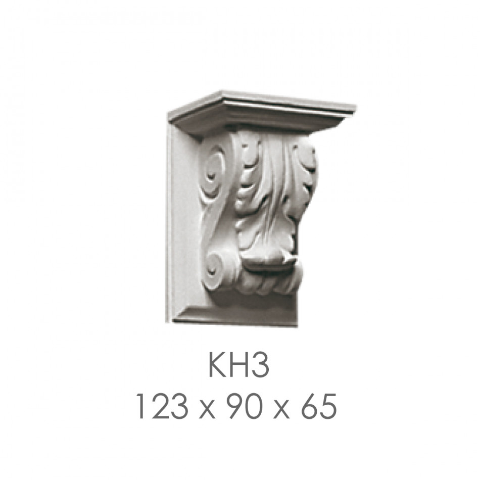 КН-3 — гіпсовий архітектурний кронштейн з вишуканими скульптурними елементами у формі мініатюрної класичної капітелі з багатою декоративною пластикою. Композиція поєднує органічні архітектурні форми класичного ордеру з деталізованими листками акантуса, волютами та барельєфним оформленням. Компактна мініатюрна композиція призначена для підтримки малих полиць, карнизів та архітектурних елементів, створюючи вишуканий архітектурний ансамбль, ідеальний для оформлення компактних внутрішніх приміщень, типовий для класичних та еклектичних інтер'єрів.