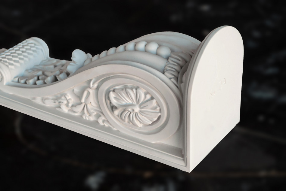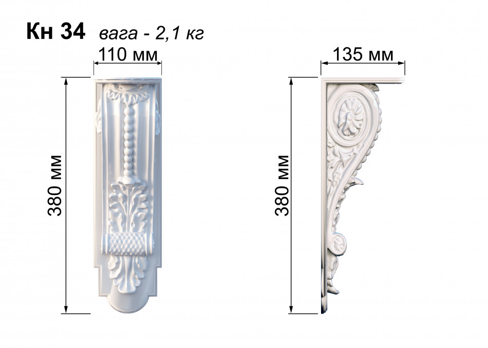 КН-34 — гіпсовий архітектурний кронштейн з вишуканими скульптурними елементами у формі класичної капітелі з багатою декоративною пластикою. Композиція поєднує органічні архітектурні форми класичного ордеру з деталізованими акантовими листками, розетками, барельєфною ліпниною та перлами. Вертикальна композиція призначена для підтримки полиць, карнизів та архітектурних елементів, створюючи вишуканий архітектурний ансамбль, ідеальний для оформлення внутрішніх приміщень, типовий для елітних інтер'єрів класицизму та неокласики.
