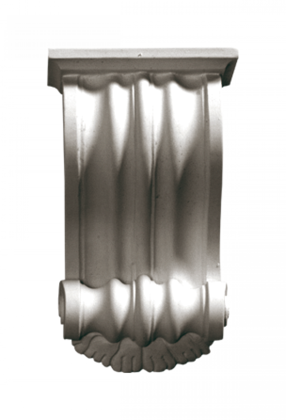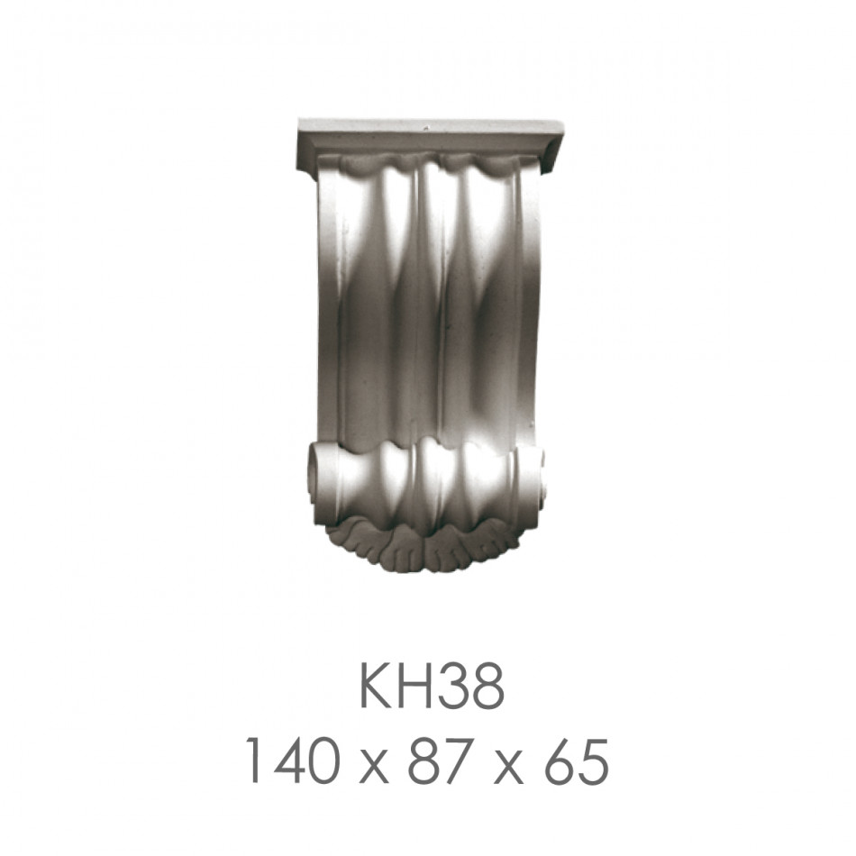 КН-38 — гіпсовий архітектурний кронштейн з вишуканими скульптурними елементами у формі класичної капітелі з багатою декоративною пластикою. Композиція поєднує органічні архітектурні форми класичного ордеру з деталізованими вертикальними канелюрами, геометричними молдингами та барельєфним оформленням. Компактна вертикальна композиція призначена для підтримки малих та середніх полиць, карнизів та архітектурних елементів, створюючи вишуканий архітектурний ансамбль, ідеальний для оформлення внутрішніх приміщень, типовий для класичних та еклектичних інтер'єрів.
