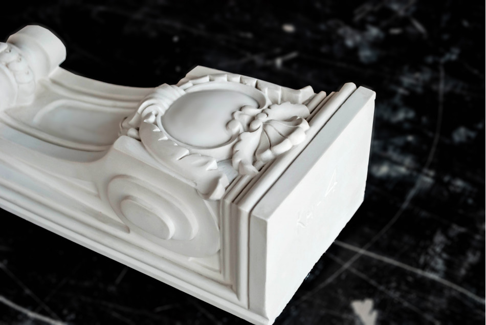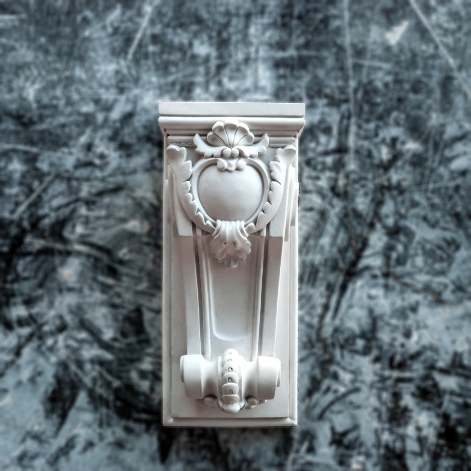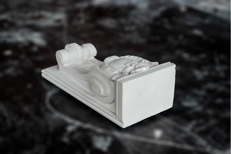 КН-4 — гіпсовий архітектурний кронштейн з вишуканими скульптурними елементами у формі класичної капітелі з багатою декоративною пластикою. Композиція поєднує органічні архітектурні форми класичного ордеру з деталізованими акантовими листками, розетками, барельєфною ліпниною та геометричними молдингами. Вертикальна композиція призначена для підтримки полиць, карнизів та архітектурних елементів, створюючи вишуканий архітектурний ансамбль, ідеальний для оформлення внутрішніх приміщень, типовий для елітних інтер'єрів класицизму та неокласики.