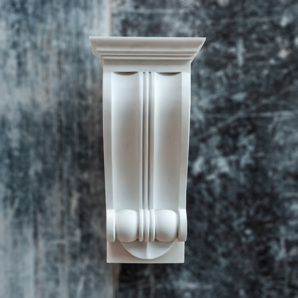 КН-5 — гіпсовий архітектурний кронштейн з вишуканими скульптурними елементами у формі класичної капітелі з багатою декоративною пластикою. Композиція поєднує органічні архітектурні форми класичного ордеру з деталізованими геометричними молдингами, заокругленими об'ємами та барельєфним оформленням. Вертикальна композиція призначена для підтримки полиць, карнизів та архітектурних елементів, створюючи вишуканий архітектурний ансамбль, ідеальний для оформлення внутрішніх приміщень, типовий для елітних інтер'єрів класицизму та неокласики.
