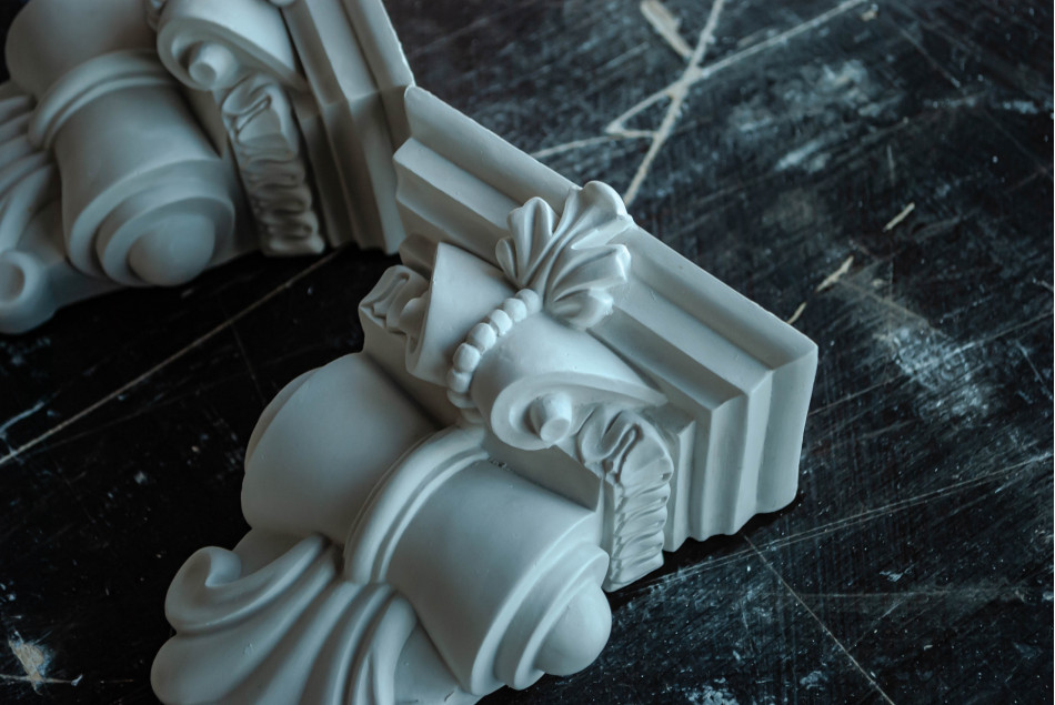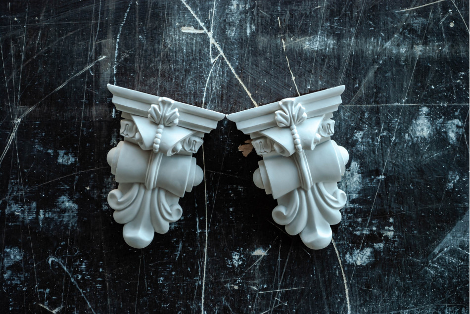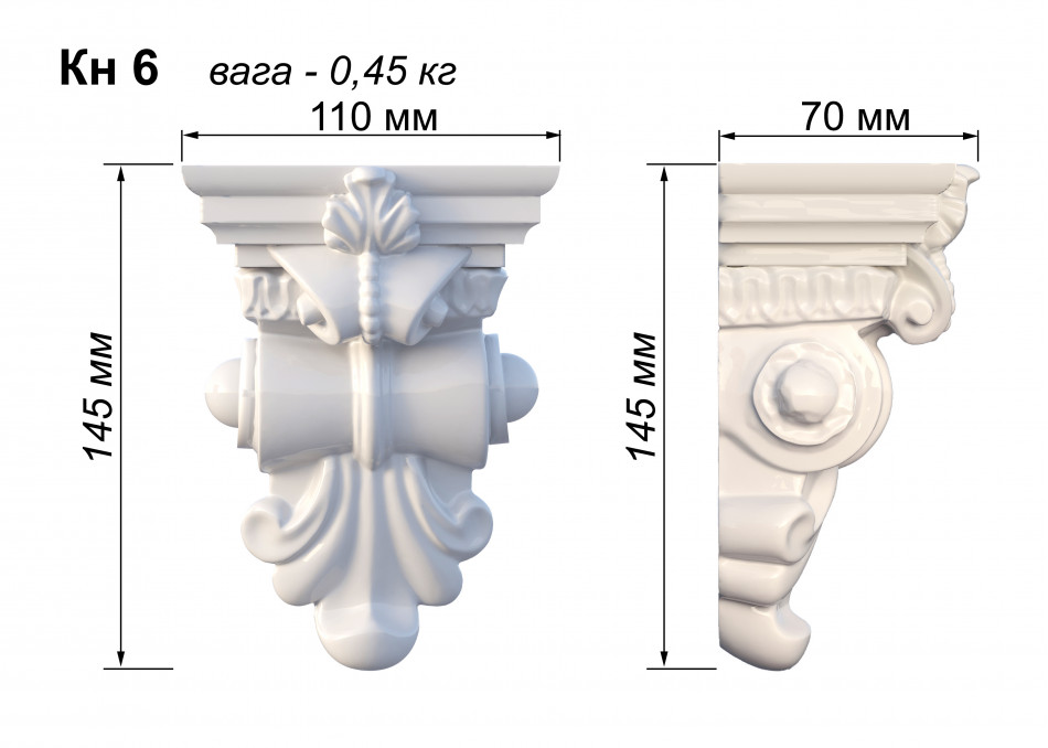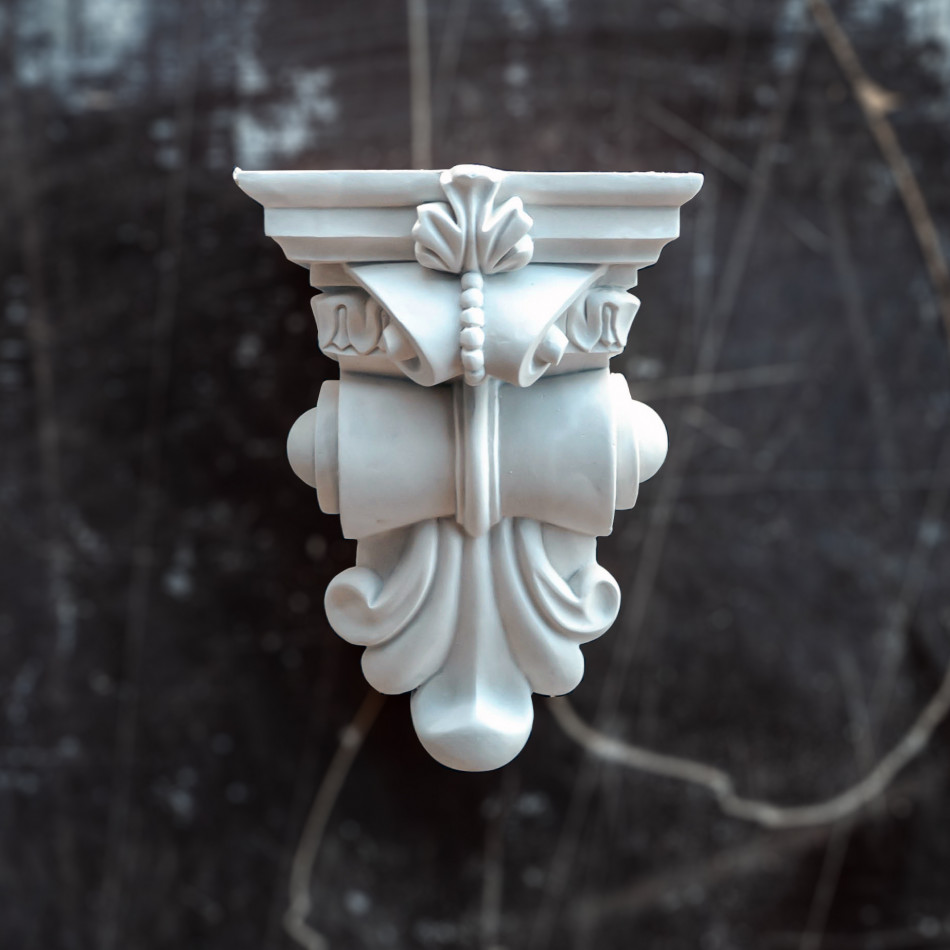 КН-6 — гіпсовий архітектурний кронштейн з вишуканими скульптурними елементами у формі класичної капітелі з багатою декоративною пластикою. Композиція поєднує органічні архітектурні форми класичного ордеру з деталізованими акантовими листками, розетками, барельєфною ліпниною та геометричними молдингами. Компактна горизонтальна композиція призначена для підтримки малих та середніх полиць, карнизів та архітектурних елементів, створюючи вишуканий архітектурний ансамбль, ідеальний для оформлення внутрішніх приміщень, типовий для класичних та еклектичних інтер'єрів.