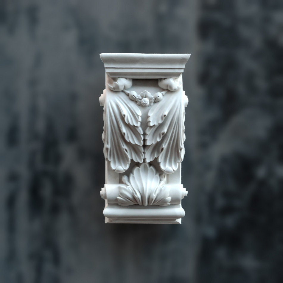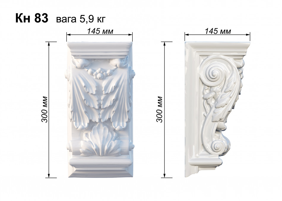 КН-83 — гіпсовий архітектурний кронштейн з вишуканими скульптурними елементами у формі класичної капітелі з багатою декоративною пластикою. Композиція поєднує органічні архітектурні форми класичного ордеру з деталізованими акантовими листками, розетками, барельєфною ліпниною та геометричними молдингами. Вертикальна композиція призначена для підтримки полиць, карнизів та архітектурних елементів, створюючи вишуканий архітектурний ансамбль, ідеальний для оформлення внутрішніх приміщень, типовий для класичних та барокових інтер'єрів.
