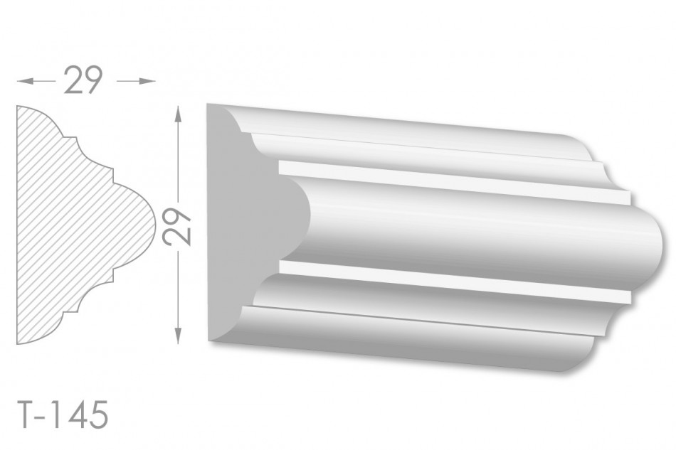 Молдинг – (Тяга) - універсальний декоративний елемент з гіпсу, оригінальної форми, який використовується для кріплення на вертикальну площину. Виріб призначений для декорування внутрішніх стін приміщень. Мета-створення особливого візуального ефекту, зонування стельової області, верхньої частини стін, завершення дизайнерського інтер'єру, внесення «останніх штрихів». Конструкція виконана з якісних матеріалів, колір – білий, відповідний кольору сировини. Молдинг може бути декорований відповідно до обраної колірної гами стилем, пофарбованим в необхідний відтінок. Параметри виробу: висота – 50 мм, ширина – 29 мм.