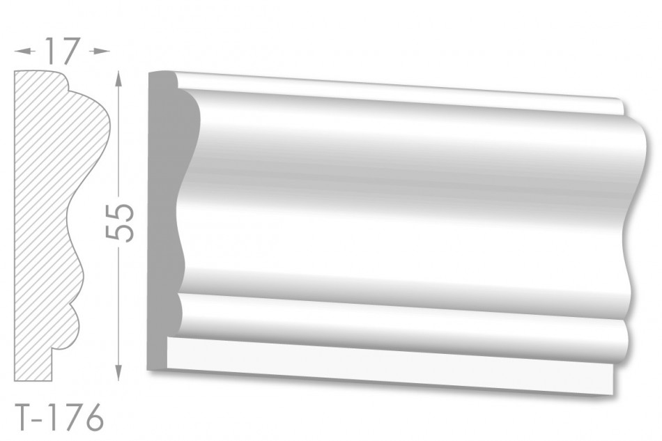 Молдинг – (Тяга) - універсальний декоративний елемент з гіпсу, оригінальної форми, який використовується для кріплення на вертикальну площину. Виріб призначений для декорування внутрішніх стін приміщень. Мета-створення особливого візуального ефекту, зонування стельової області, верхньої частини стін, завершення дизайнерського інтер'єру, внесення «останніх штрихів». Конструкція виконана з якісних матеріалів, колір – білий, відповідний кольору сировини. Молдинг може бути декорований відповідно до обраної колірної гами стилем, пофарбованим в необхідний відтінок. Параметри виробу: висота – 55 мм, ширина – 17 мм.
