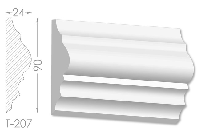 Молдинг – (Тяга) - універсальний декоративний елемент з гіпсу, оригінальної форми, який використовується для кріплення на вертикальну площину. Виріб призначений для декорування внутрішніх стін приміщень. Мета-створення особливого візуального ефекту, зонування стельової області, верхньої частини стін, завершення дизайнерського інтер'єру, внесення «останніх штрихів». Конструкція виконана з якісних матеріалів, колір – білий, відповідний кольору сировини. Молдинг може бути декорований відповідно до обраної колірної гами стилем, пофарбованим в необхідний відтінок. Параметри виробу: висота – 90 мм, ширина – 24 мм.