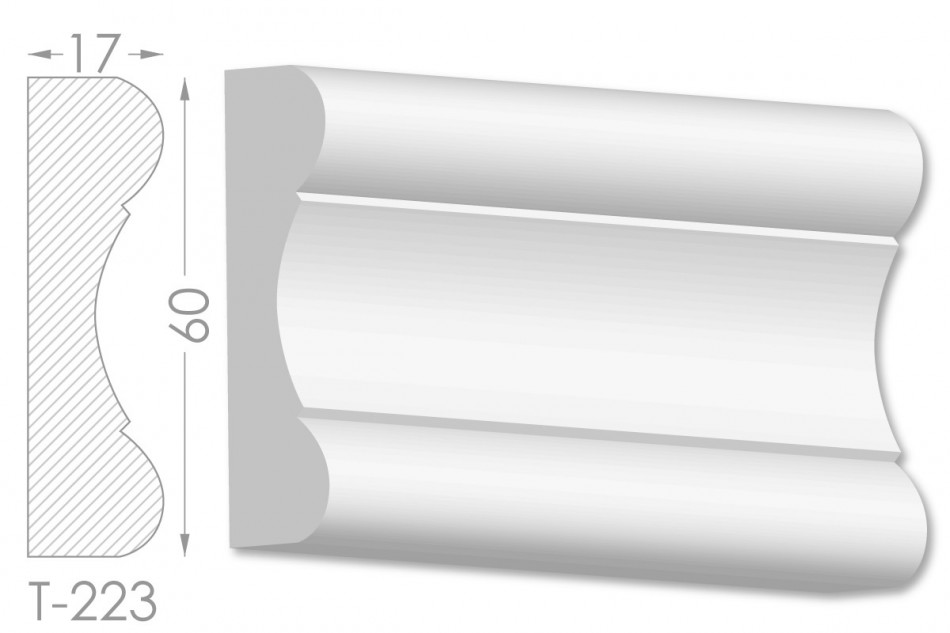 Молдинг – (Тяга) - універсальний декоративний елемент з гіпсу, оригінальної форми, який використовується для кріплення на вертикальну площину. Виріб призначений для декорування внутрішніх стін приміщень. Мета-створення особливого візуального ефекту, зонування стельової області, верхньої частини стін, завершення дизайнерського інтер'єру, внесення «останніх штрихів». Конструкція виконана з якісних матеріалів, колір – білий, відповідний кольору сировини. Молдинг може бути декорований відповідно до обраної колірної гами стилем, пофарбованим в необхідний відтінок. Параметри виробу: висота – 60 мм, ширина – 17 мм.